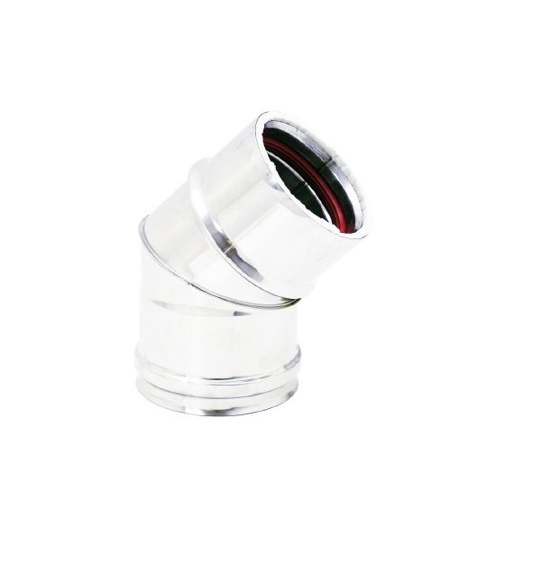 Gomito a 45° in acciaio inox doppia parete coibentato con intercapedine da 10 mm.