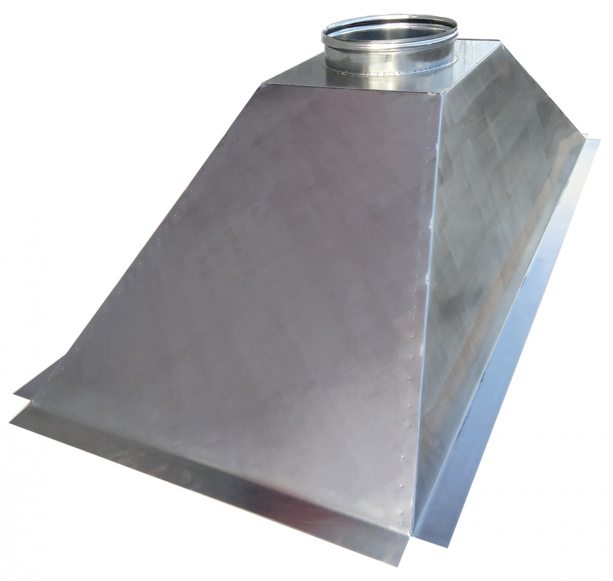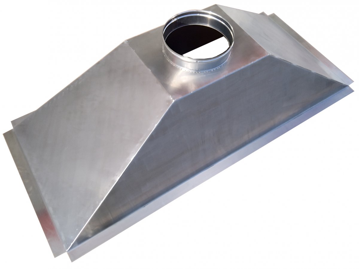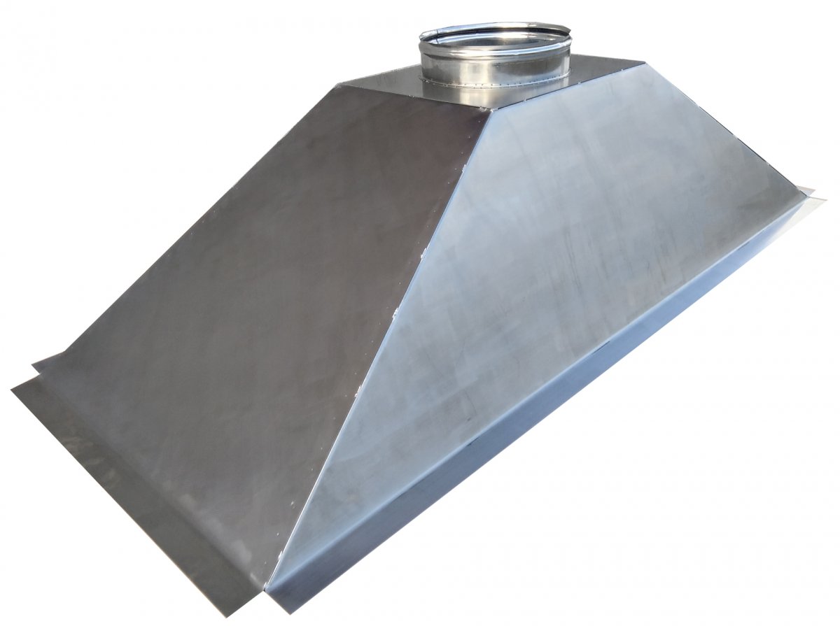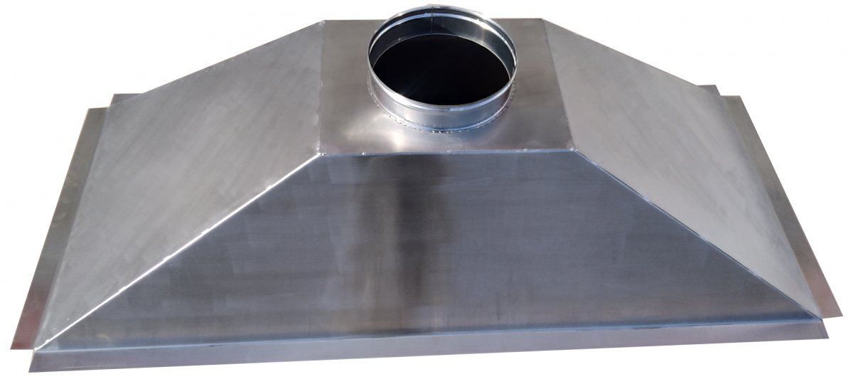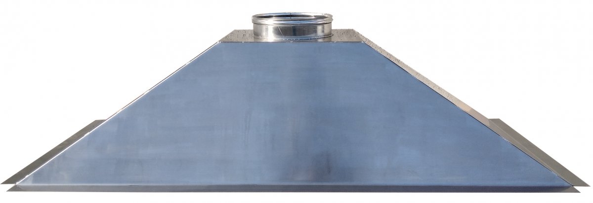 Cappa per barbecue in Acciaio Inox AISI304 sp. 0,8 mm con finitura opaca. Strutturata per il fissaggio su struttura di base con base le apposite alette longitudinali uscita fumi circolare decentrata in adiacenza della parete posteriore.