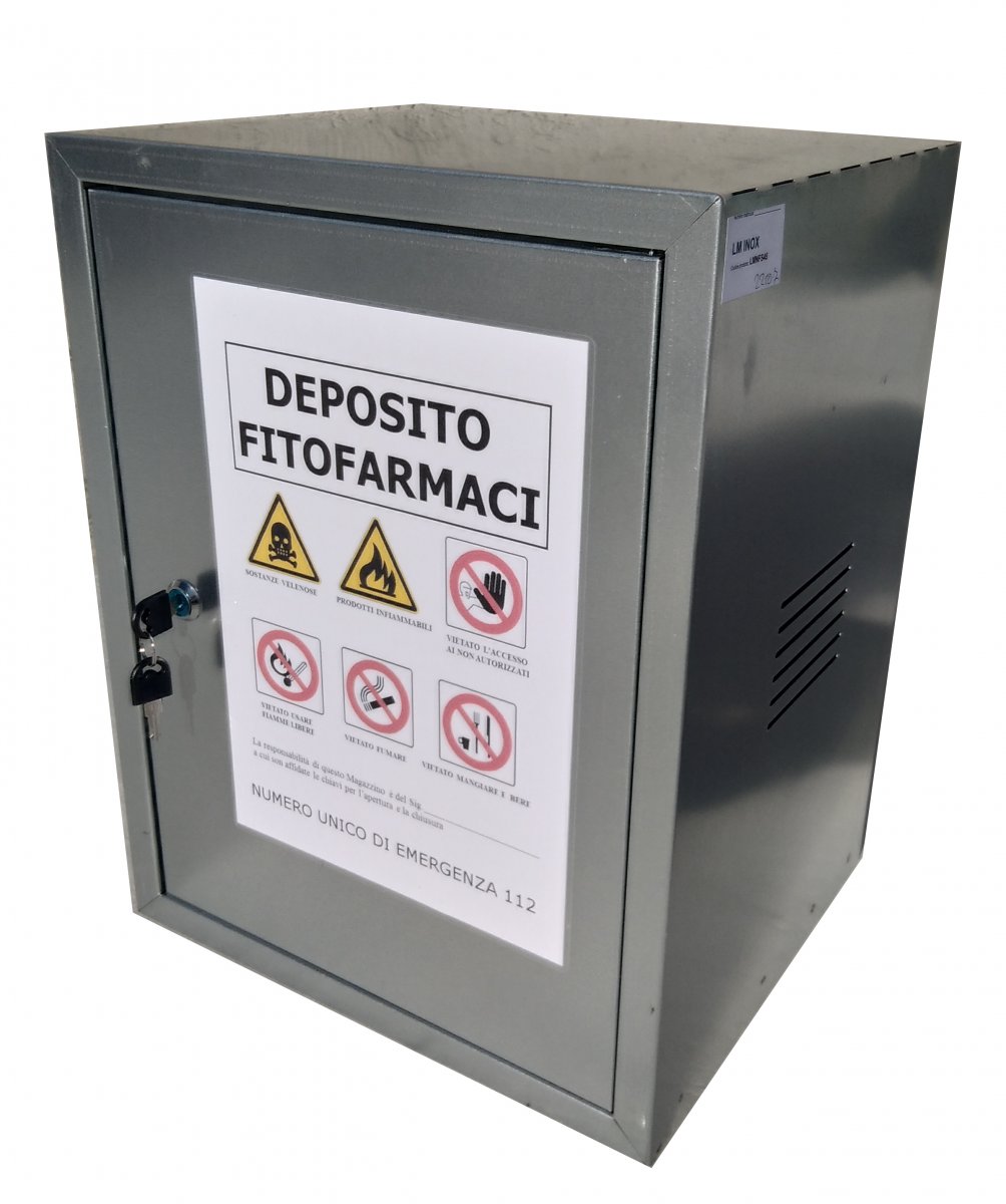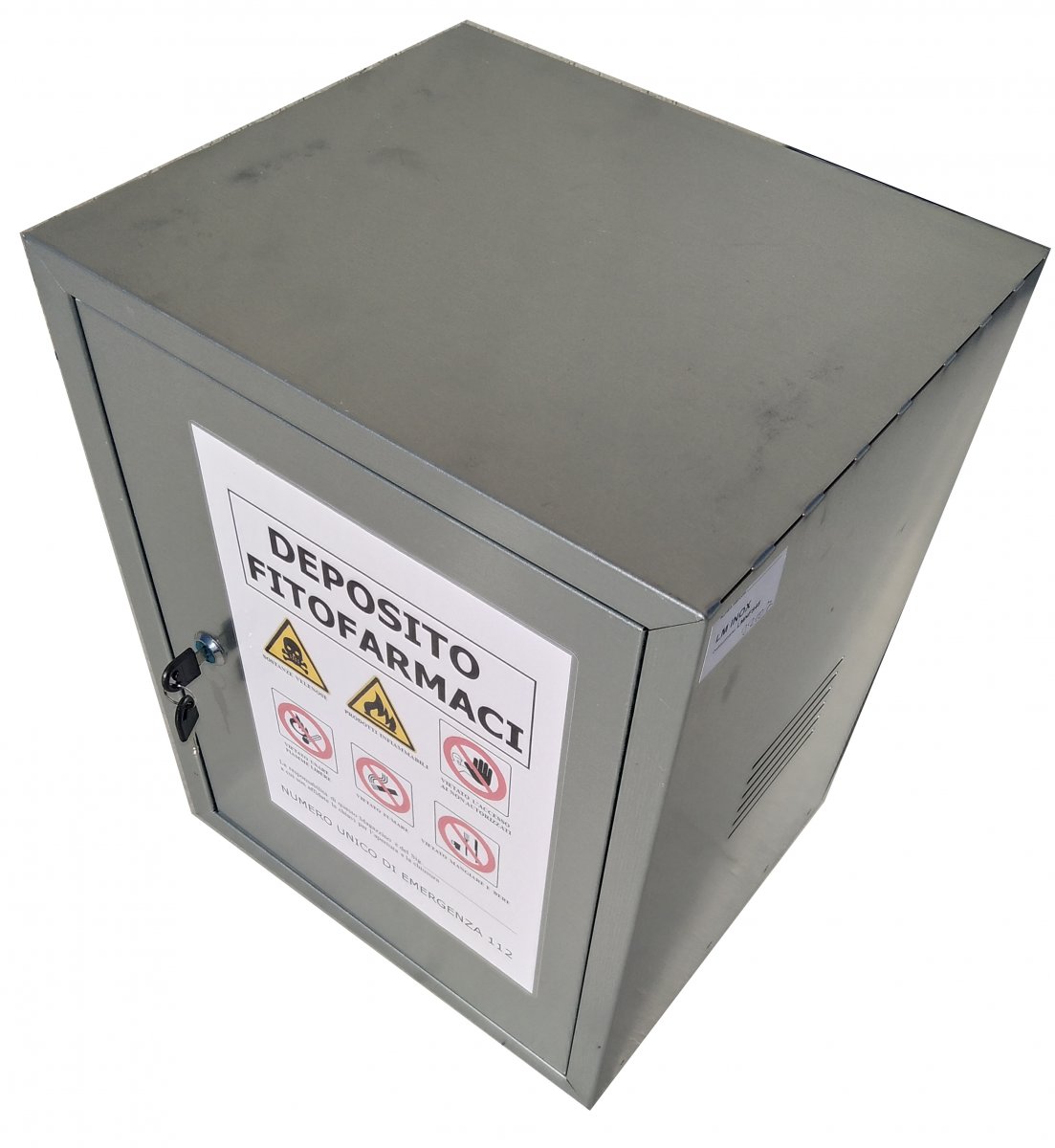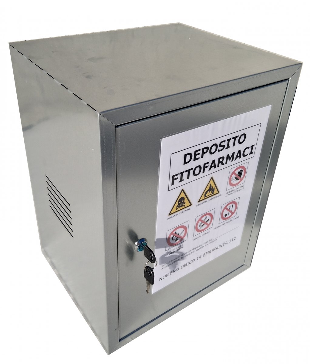 Armadietto per deposito prodotti fitosanitari / fitofarmaci in lamiera zincata, di nostra produzione e rispondente a tutte le caratteristiche richieste dalle normative di riferimento riguardanti lo stoccaggio dei suddetti prodotti, indispensabile per tutte le aziende agricole, viene fornito corredato da regolare Dichiarazione di conformità. L'ideale per aziende facenti un uso minimo di fitofarmaci.
