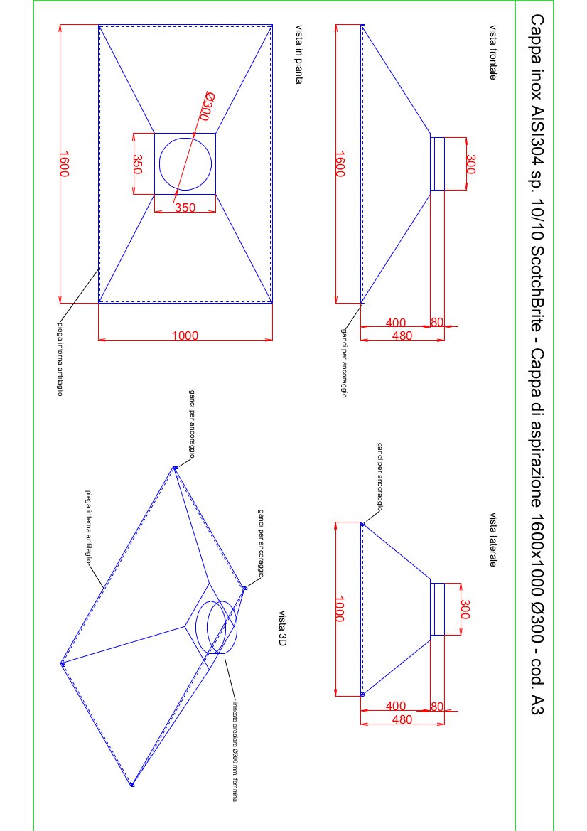 Cappa in acciaio inox AISI304 sp. 1 mm. con finitura opaca a base rettangolare predisposta per fissaggio in sospensione mediante gli appositi ganci forati posizionati negli angoli della base.