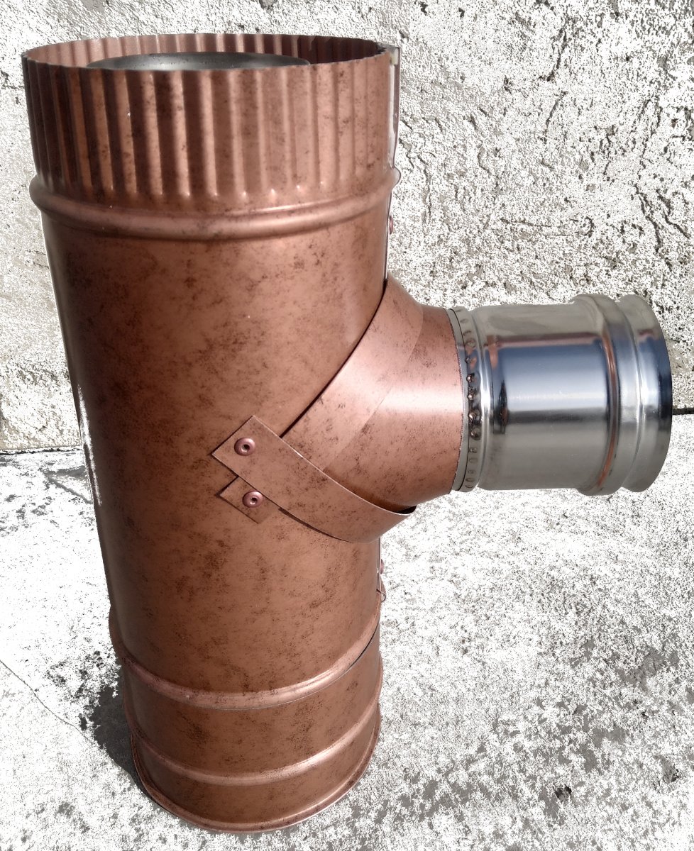 Raccordo a T a 90° doppia parete con innesto monoparete femmina interno in acciaio inox, coibentazione in lana di roccia ad alta densità sp. 25 mm. e rivestimento esterno in alluminio preverniciato effetto Rame antichizzato. Fa parte della linea di tubazioni coibentate che abbinano la sicurezza e la funzionalità dell'Acciaio inox coibentato e la gradevolezza estetica dell'Alluminio effetto rame antichizzato per installazioni in ambienti rustici o comunque dove non è adatto l'effetto lucido del tubo in acciaio inox. Da abbinare con il tappo di raccolta ad innesto maschio (fare riferimento al diametro esterno) nel caso di installazione in raccordo fra tratto orizzontale e tratto verticale.
