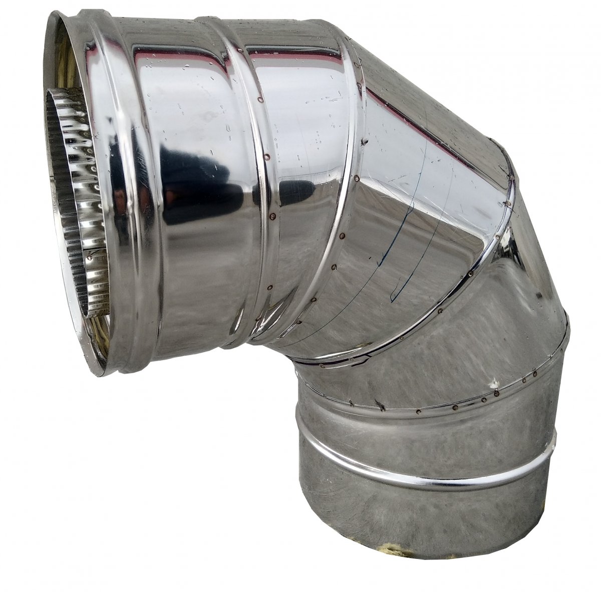Gomito in acciaio inox doppia parete coibentato a 4 settori, realizzabile su ordinazione, con gradazione speciale su misura da 68 a 89°.