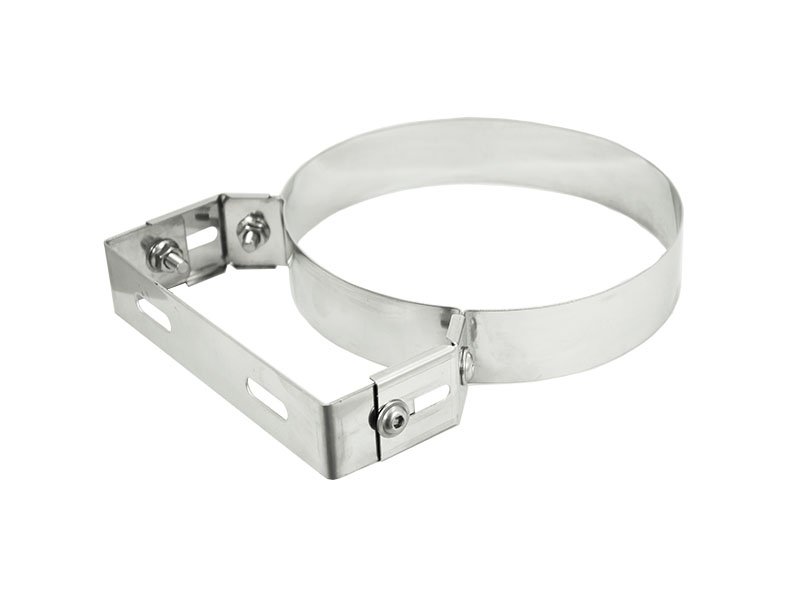 Collare in acciaio inox con piastra forata per fissaggio a parete con distanza regolabile da 50 a 100 mm.