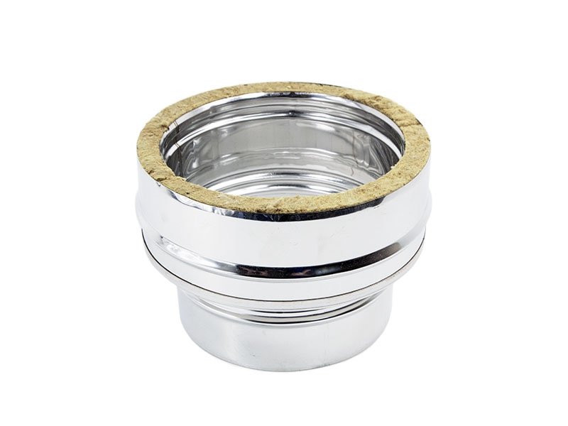 Adattattatore in acciaio inox doppia / mono parete per il raccordo di tubazioni coibentate con tubazioni monoparete. Innesto monoparete maschaio - doppia parete femmina.