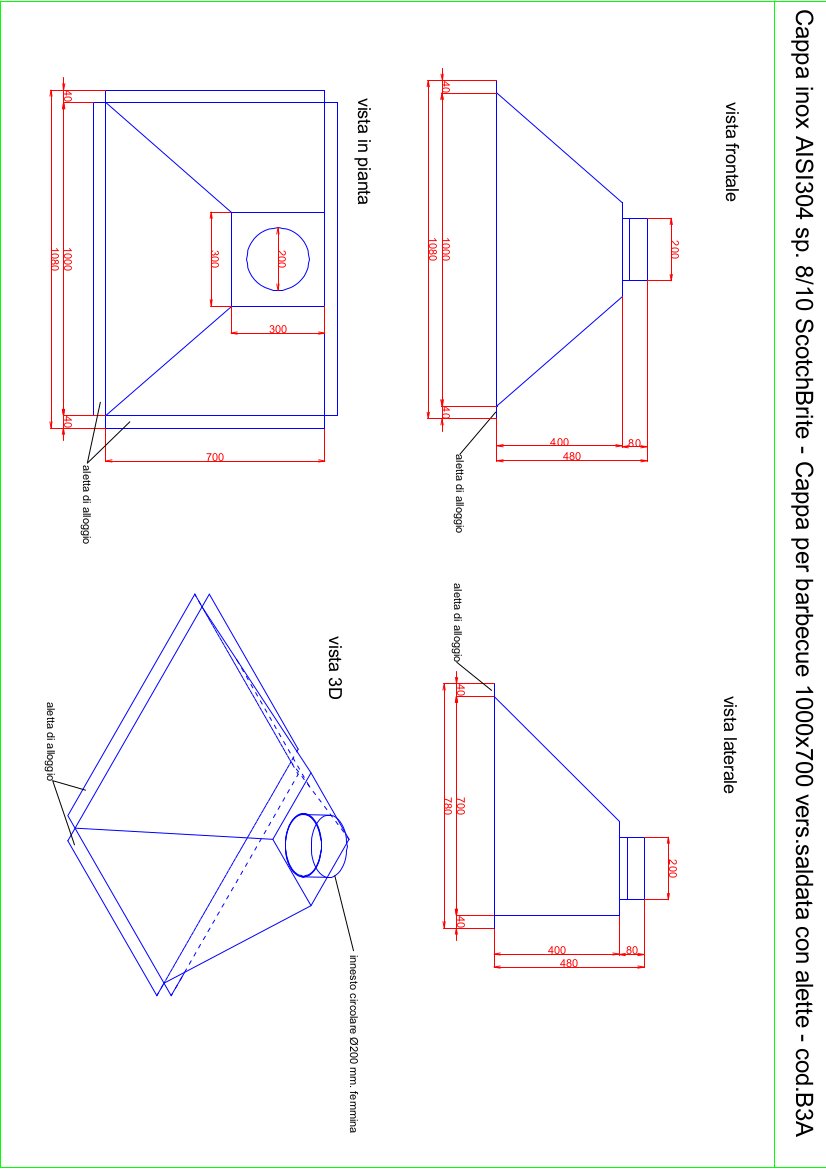 Cappa per barbecue in Acciaio Inox AISI304 sp. 0,8 mm con finitura opaca. Strutturata per il fissaggio su struttura di base con base le apposite alette longitudinali uscita fumi circolare decentrata in adiacenza della parete posteriore.